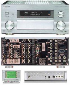 Verstärker-Merkmale: 2 x 170 Watt Stereo (6 Ohm, DIN Sinus) 7 x 170 Watt Surround (6 Ohm, DIN Sinus) THX Ultra 2 Cinema THX Surround EX Integrierte Decoder für: Dolby Digital & Dolby ProLogic II, DTS 96/24, DTS-ES, Discrete 6.1, DTS NEO:6, DTS (Digital Theater Systems), MPEG-2 Multichannel 7 DSP-Betriebsarten 4 Advanced Theater-Betriebsarten 96 kHz / 24-Bit A/D-Wandler (2ch / 7.1ch) Multichannel DNR (Digitale Rauschunterdrückung) M.C.A.C.C. (Multichannel Acoustic Calibration System) i.LINK - Schnittstelle Videokonverter (FBAS & Y/C auf YUV-Komponente) Programmquellen-Umbenennung Multichannel Stereophonic Concept: Advanced Direct Energy MOS-FET für alle Kanäle, Direct Current Bus-Bar, Direct Construction Design, 650 VA Transformator, 33.000 µF Capacitor mit 50 Phasenverschiebung, zweilagiges verkupfertes Chassis (70 µm) Akustisch optimierte Aluminium-Seitenpanel LCD-Touch-Panel-Fernbedienung: vorprogrammiert & lernfähig neue grafische Benutzerführung flexible Macro-Programmierung Hintergrundbeleuchtung Bedienungsmerkmale: DOT-Matrix Display mit Dimmer (4-stufig) Benutzerführung mit On-Screen-Display Eingangswahl via Jog Dial, Video Selector Source Direct / 5-ch-Stereo Klangregler für Front-LS & Balance im Stereobetrieb Feineinstellung für Lautsprecher-Setup: Klangregler für alle Kanäle im Surroundbetrieb, Klangregler für alle Kanäle im Surroundbetrieb, Pegelabgleich in 0,5 dB Schritten, Verzögerung in 10cm Schritten Midnight Mode Loudness, Muting Anschlussmöglichkeiten: 2x i.LINK 7.1-Kanal-Eingang für DVD-Audio & SACD Audio-/Video-Eingänge: 7AV / 5A 3 YUV-Komponenten-Eingänge (HDTV-fähig) alle Videoeingänge & Ausgänge in S-Video & FBAS (7/4) Front AV-Eingang inkl. S-Video & opt. Digitaleingang AC-3 RF-Eingang (für LaserDisc) 8 Digital-Eingänge (3x koaxial, 5x optisch) 2 Digital-Ausgänge (optisch) Audio-/Video-Ausgänge: 2A / 3AV / 2V YUV-Komponenten-Ausgang (HDTV-fähig) 7.1-Vorverstärkerausgang RS-232 Schnittstelle für zukünftige Updates vergoldete Anschlussterminals Lautsprecheranschlüsse geeignet für Bananenstecker Sonstiges: Aluminium-Frontpanel Massive Aluminium-Frontklappe Abmessungen (BxHxT): 440 x 204 x 470 mm Gewicht: 29,5 kg